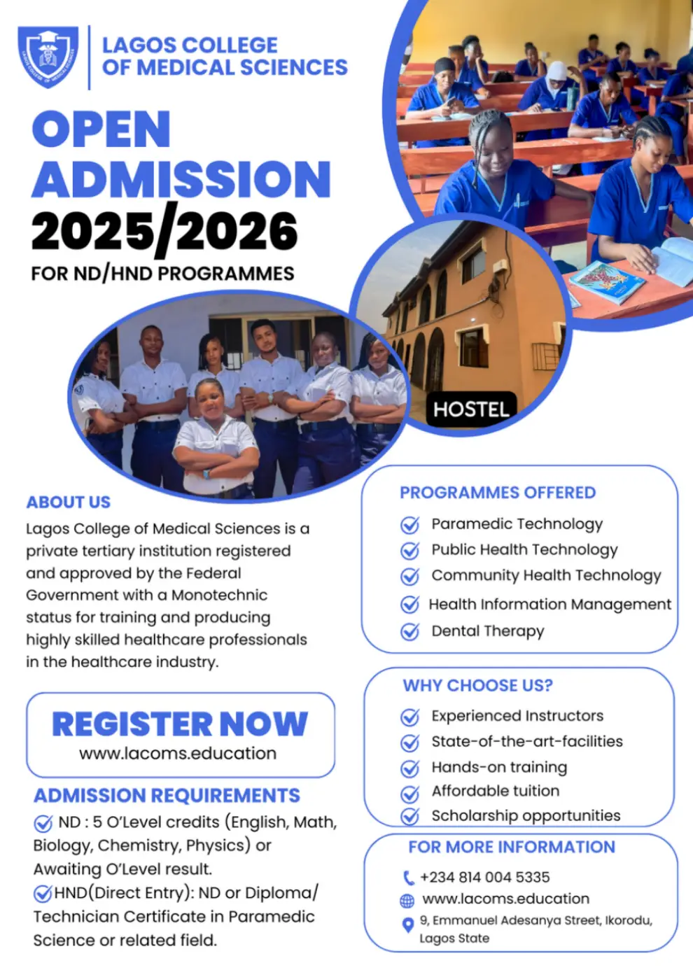 Admissions are currently in progress at Lagos College of Medical Sciences for the 2025/2026 academic session.